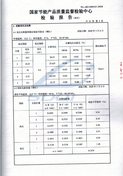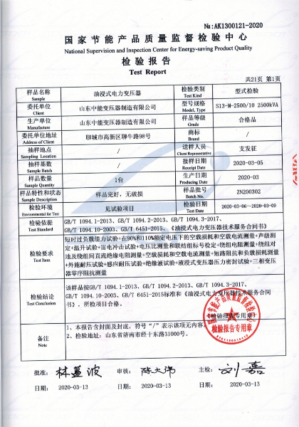 國家節(jié)能產(chǎn)品質(zhì)量監(jiān)督檢驗中心 查詢編號:AK1300121 查詢備案證書號:GJJN-B-K2000121 批準日前:2020-03-13 公司名稱:山東中能變壓器制造有限公司
